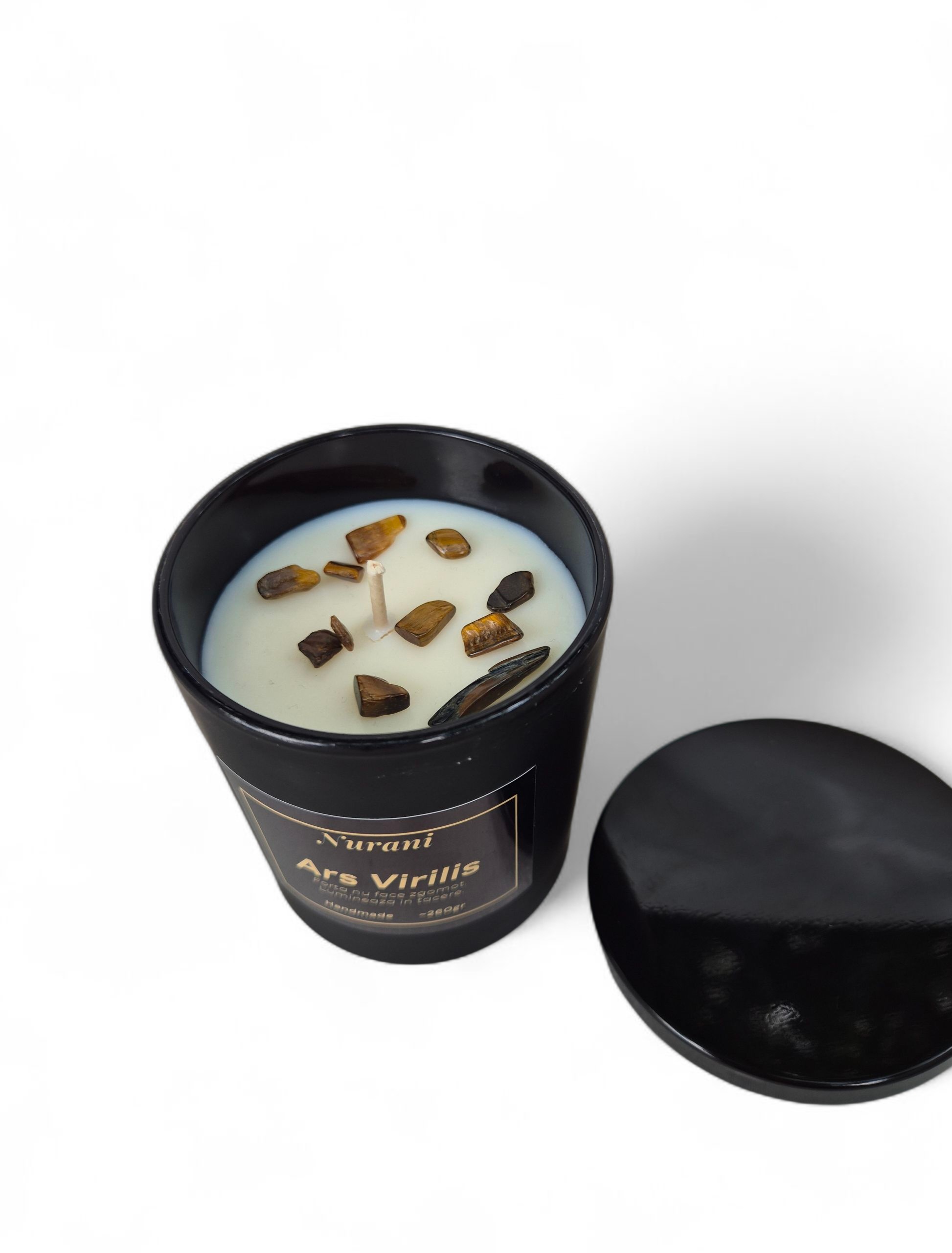 Creată pentru bărbatul ancorat în sine, „Ars Virilis” este o lumânare cu prezență puternică și calmă. Tămâia deschide spațiul interior, cedrul aduce claritate, iar lemnul de santal învăluie totul într-o căldură profundă și rafinată. Piatra ochi de tigru – simbol al curajului, echilibrului și voinței – adaugă o vibrație discretă de încredere și echilibru.